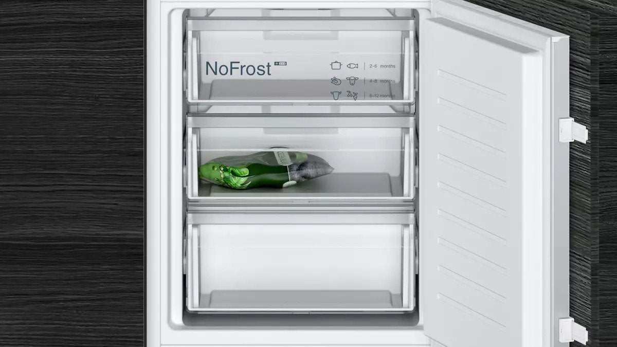 This built-in fridge freezer from Siemens has a total volume of 260L. The fridge compartment has a bottle rack, 3 height adjustable shelves and LED lighting. The freezer compartment has 3 freezer drawers and a superFreezing function to quickly freeze new food. The KI86NVSE0G features a door alarm if the door has been left open for too long and the noFrost technology means you won’t have to defrost your freezer again.