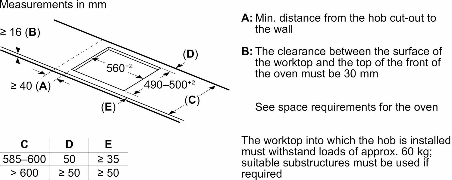 - Minimum Niche Size for Installation (HxWxD): 51 x 560 x 490-500 mm