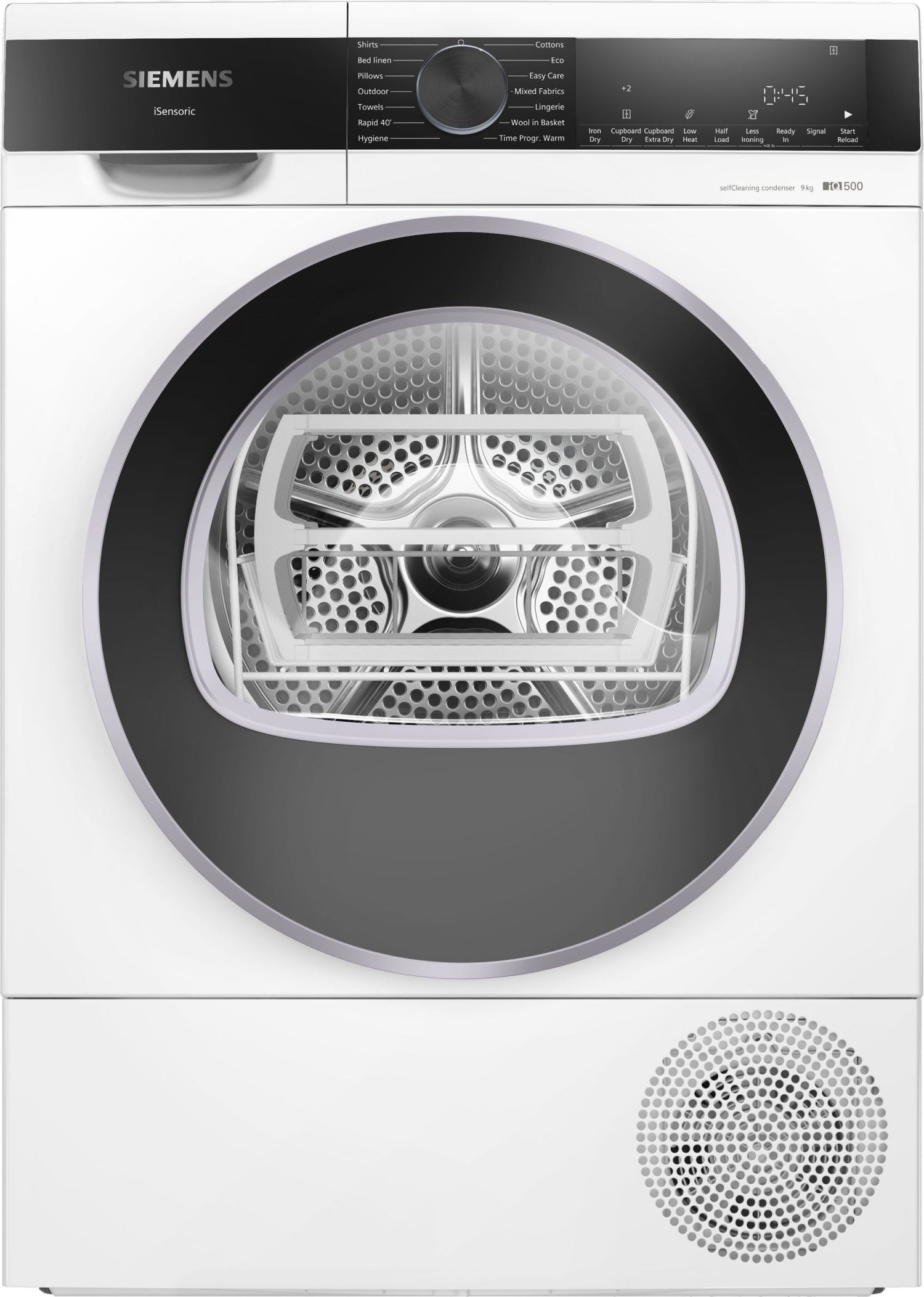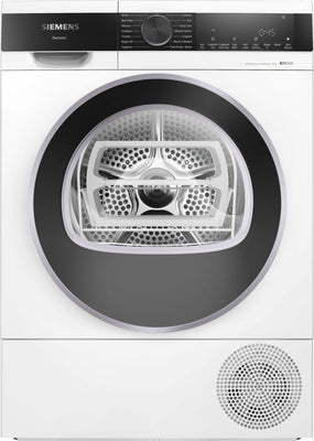The Siemens WQ45G203GB iQ500 9kg Heat Pump Condenser Tumble Dryer combines energy efficiency with advanced drying technology. With an A+++ energy rating, self-cleaning condenser and automatic load recognition, it ensures economical performance while protecting fabrics. The SoftDry drum system and 13 drying programmes, including delicates, wool basket, and outdoor wear, provide versatile care for every load. Quiet at just 61dB, it features a large LED display, delay start, and anti-crease option for added convenience. Designed with an AntiVibration build and child lock, this freestanding dryer offers reliable, quiet and safe operation for everyday family laundry.