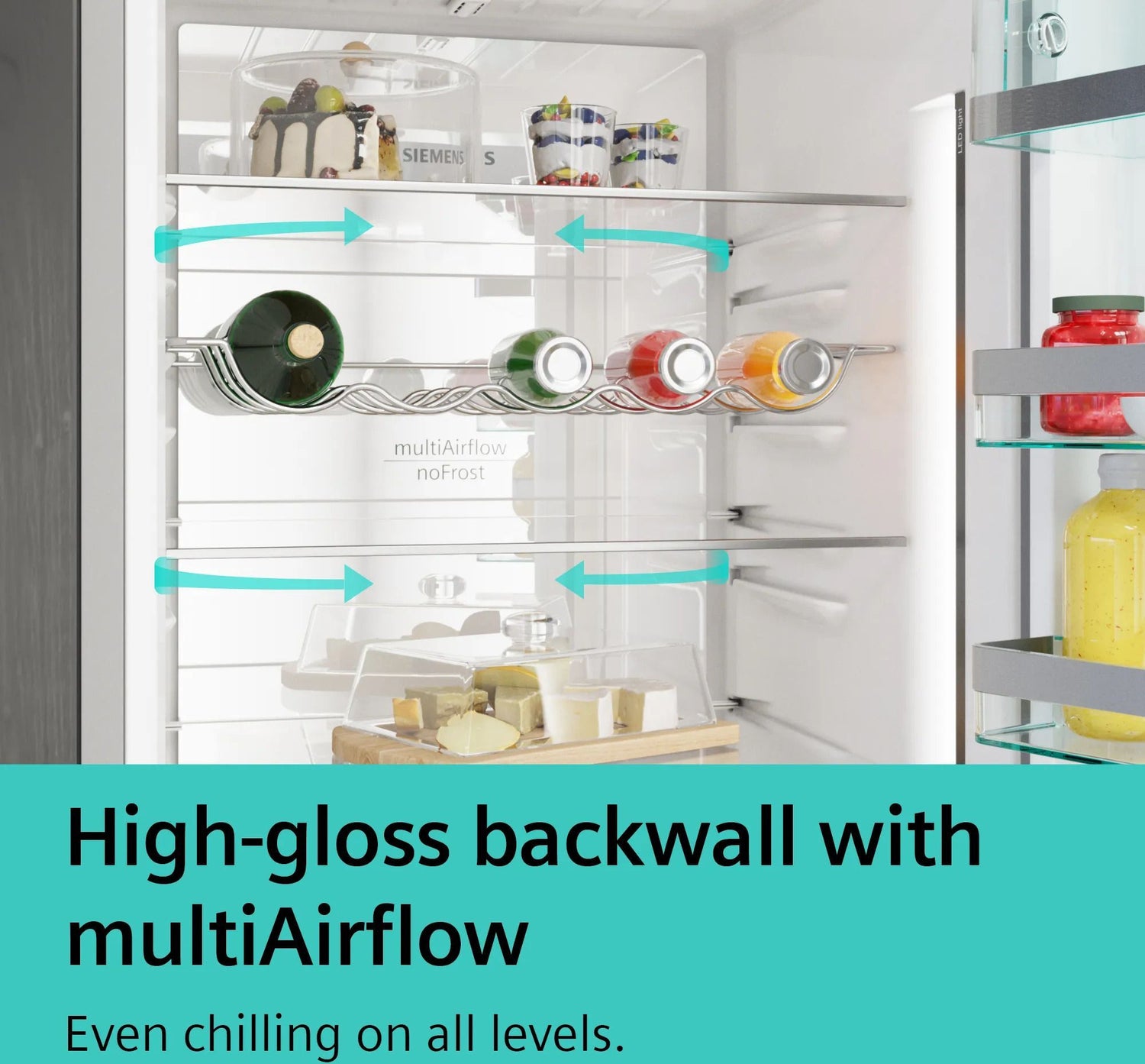 The Siemens KG39NXIBF goes a step further in preserving the freshness and taste of your foods with its high-gloss backwall and multiAirflow system, which guarantees evenly chilled conditions on all levels. The convenience is further amplified by the addition of a bottleRack for secure and easy-access bottle storage, and the superCooling function, which provides faster cooling for freshly stored food items.