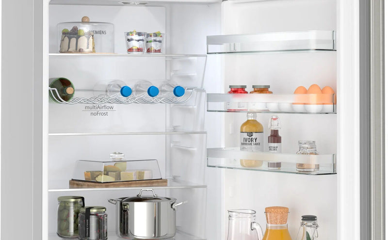 Featuring a 4-star freezer rating, height-adjustable shelves, humidity control, an interior light, and both visual and audible open door alerts, this model is designed for both efficiency and convenience. The temperature controls, recommended temperature ranges for both the fridge and freezer, temperature warnings, and additional features like the hyperFresh 0° c drawer and super freeze function, further exemplify Siemens' commitment to preserving your food's freshness and quality.