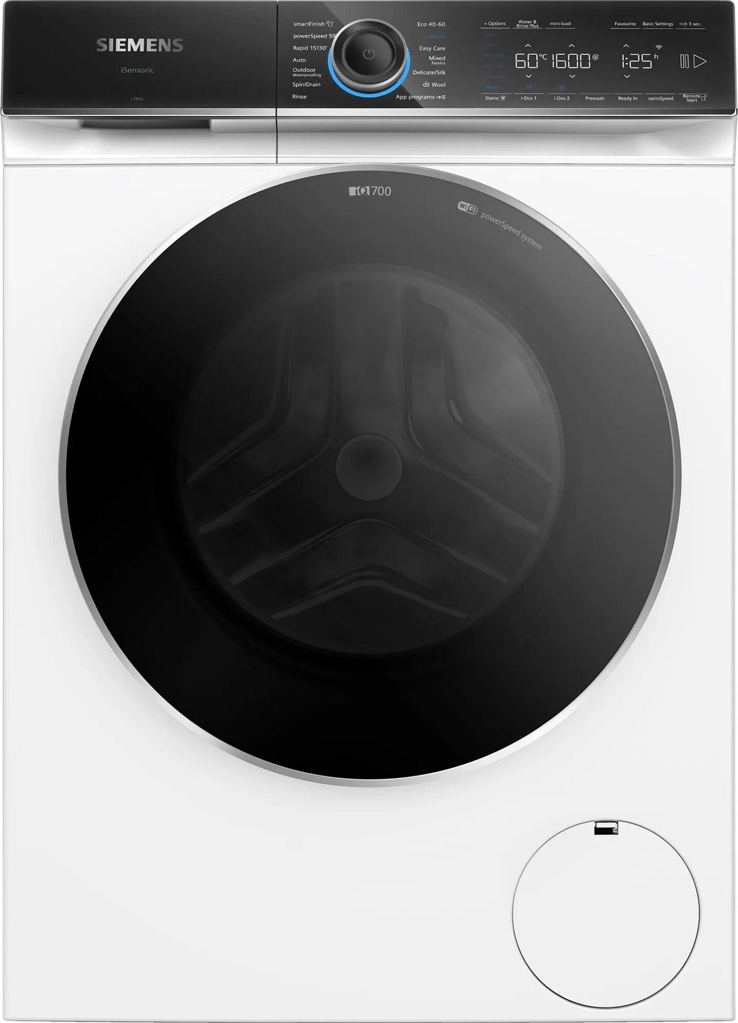 The Siemens WG56B2A1GB iQ700 washing machine combines style and efficiency in a sleek white design. With a generous 10kg drum capacity, this Internet-enabled appliance is fitted with Siemens' innovative i-Dos self-dosing technology for optimal use of detergent. The machine operates quietly at 72dB during spins and features 14 diverse wash programmes, providing convenience and adaptability. A standout feature is its VarioSpeed function, which offers a full quick wash in just 59 minutes. In addition, the WG56B2A1GB boasts eco-friendly credentials with an A energy rating, and the AquaStop feature offers anti-flood protection. With Siemens iQdrive motor system and HomeConnect compatibility, this washing machine combines high performance with smart technology.