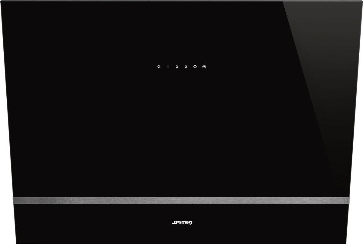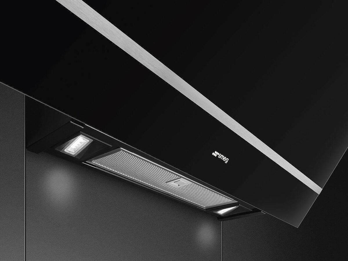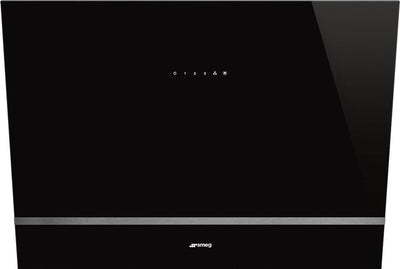 Clearing the kitchen air after cooking is simple with this 80cm wide Smeg KV28N wall mounted cooker hood, featuring a contemporary black finish. To clear the air in your kitchen, select one of three standard speed settings using the intuitive touch control panel, or select the 666 M³/H boost function to make short work of extra strong smells. Two LED lights offer convenient task lighting to the cooking surface, while the hood itself features a modern design that will compliment any contemporary kitchen.