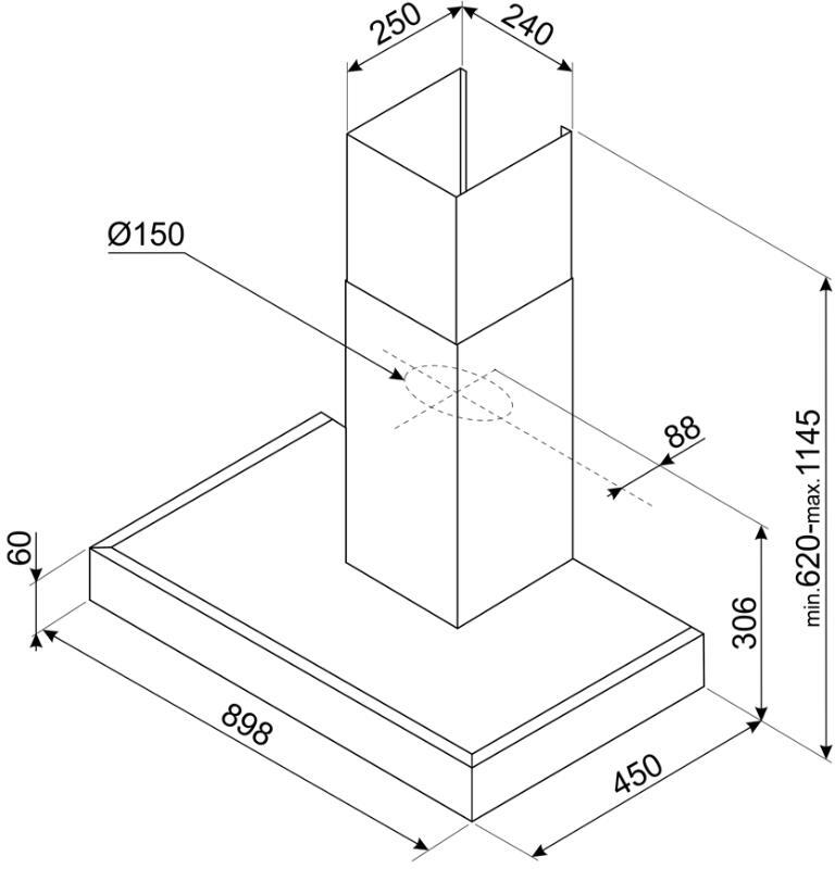 Noise levels are considerately managed, ranging between 47 and 68 dB. This ensures that your kitchen remains a tranquil environment, even when the hood is working at its maximum capacity. The Smeg KATE900EX is designed for both air extraction and recirculation modes, offering flexibility based on your kitchen's layout and ventilation requirements.