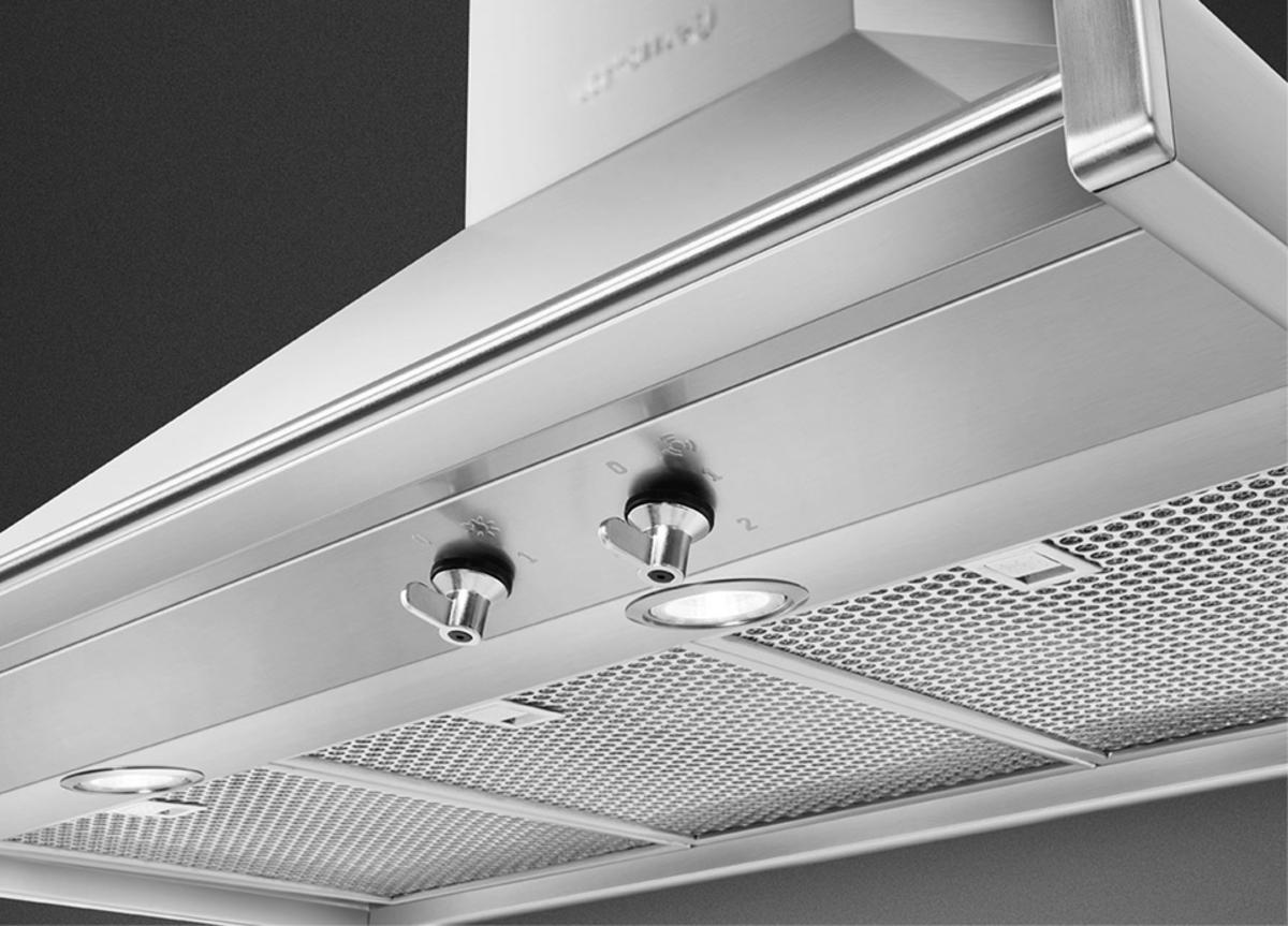 This highly energy efficient 150cm chimney hood from Smeg conceals five dishwasher safe grease filters behind a clean and elegant stainless steel exterior. Use the steel effect control knobs to choose one of the three fan speeds, or the extra intensive mode, which work quickly to clear grease, cooking odours and vapours from the air while you cook. The four LED lights on the KD150HXE helpfully illuminate the pans on your hob.