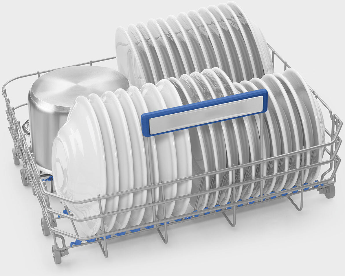 The interior of the dishwasher is designed with practicality in mind. The stainless steel cavity is durable and easy to clean, while the adjustable racking and height-adjustable upper basket provide flexibility to accommodate dishes of various sizes. The lower basket includes four foldable racks, making it easy to fit larger pots and pans. The inclusion of a cutlery basket and tray ensures that utensils are cleaned thoroughly and efficiently. The FlexiDuo system further enhances the versatility, allowing for the upper basket to be configured in multiple ways to suit your needs.