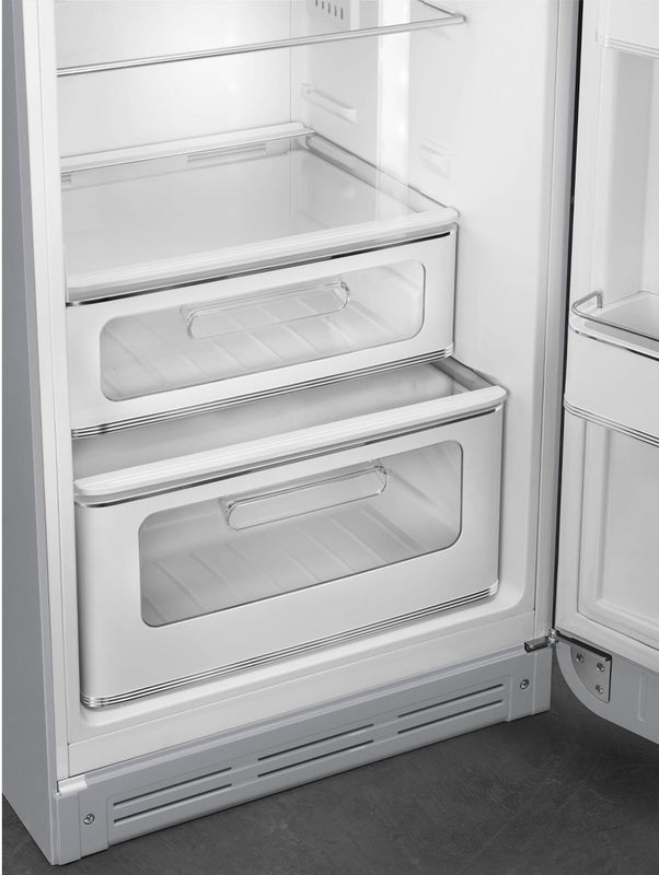 This model operates at a quiet 37 dB, making it unobtrusive in open-plan homes or small kitchens where noise can be an issue. The LED interior light offers excellent visibility without excessive power consumption, and electronic temperature controls allow easy adjustment of the fridge’s internal climate. Smeg’s MultiFlow cooling system ensures even cooling throughout the fridge, keeping all items fresh and at an ideal temperature. Visual and audible alerts signal when the door is open or if there’s a temperature fluctuation, adding an extra layer of food safety.