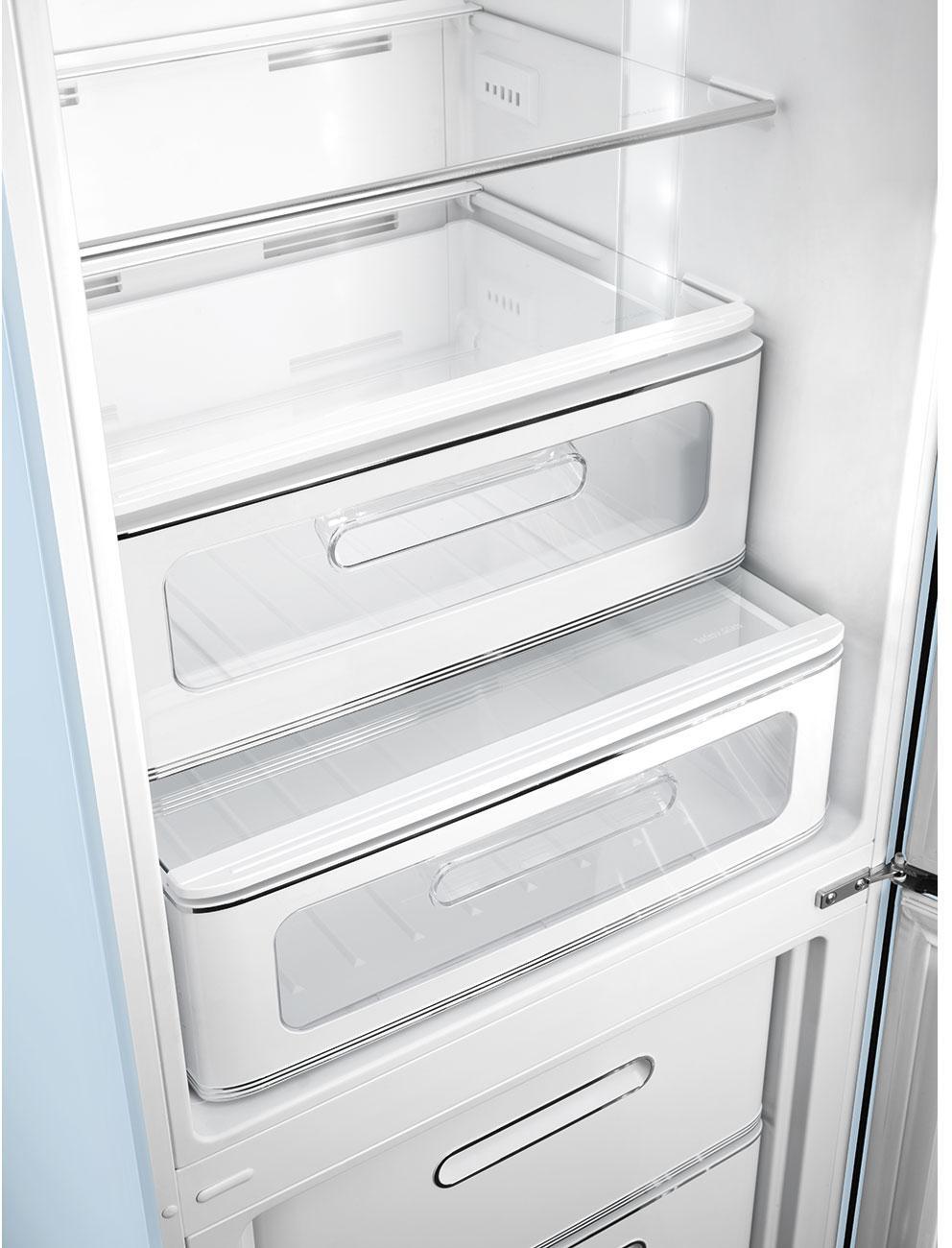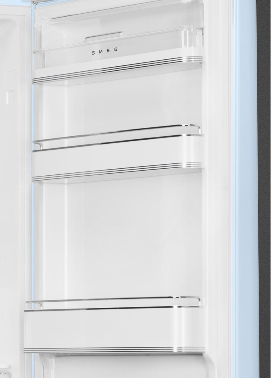 This pastel blue, right-hinged frost-free Smeg FAB32RPB5UK fridge freezer is part of the 1950s Retro Aesthetic range, combining vintage styling with the latest technology to achieve an excellent energy-efficiency rating. The 234 litre fridge contains three adjustable glass shelves, a fruit and vegetable crisper and a 0°C Life Plus drawer, which preserves perishable food for longer. The 97 litre three-drawer freezer has No Frost technology, so it’ll never require defrosting, and it includes a fast freezing drawer.