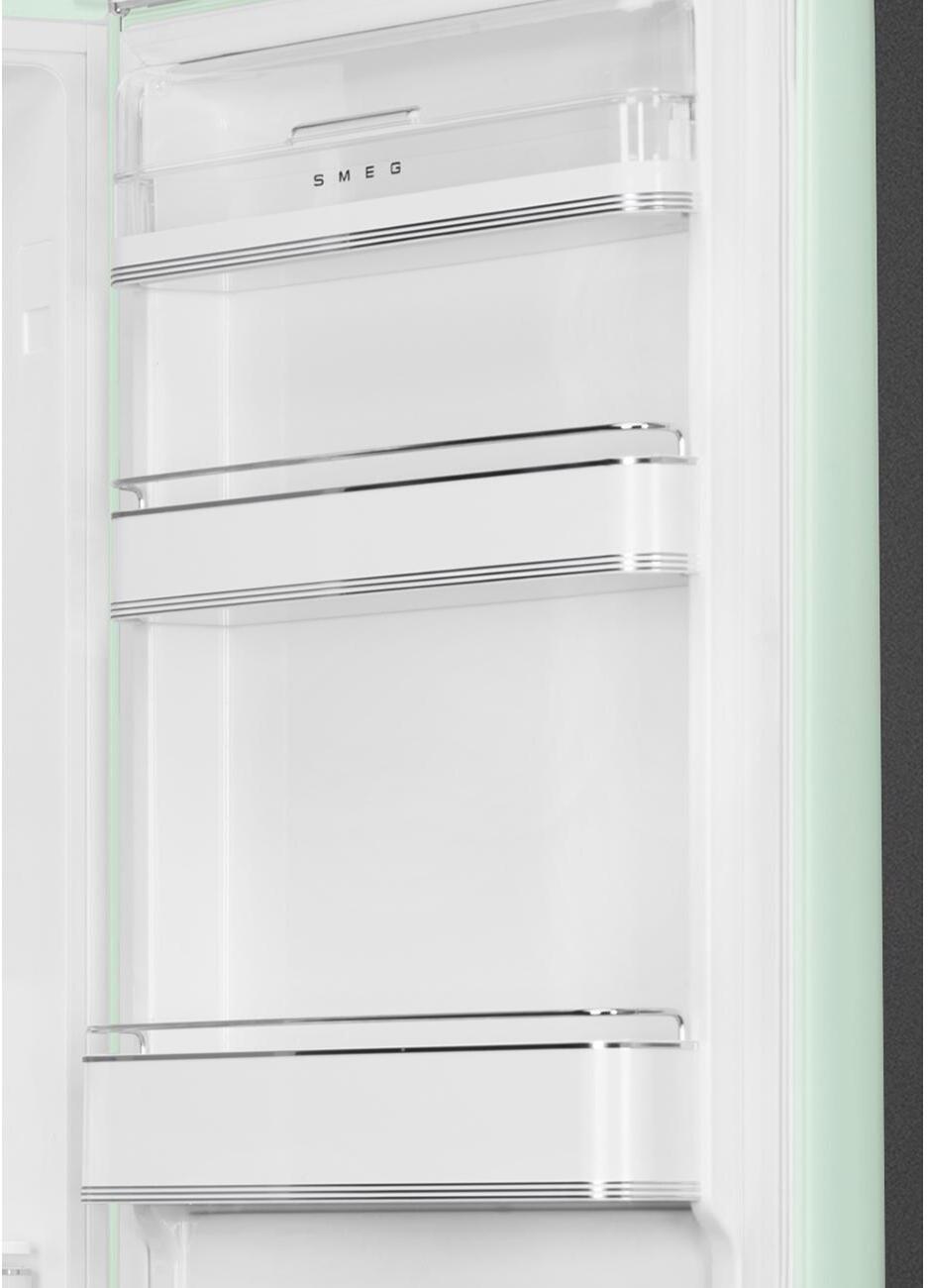 This pastel green, right-hinged frost-free Smeg FAB32RPG5UK fridge freezer is part of the 1950s Retro Aesthetic range, combining vintage styling with the latest technology to achieve an excellent energy-efficiency rating. The 234 litre fridge contains three adjustable glass shelves, a fruit and vegetable crisper and a 0°C Life Plus drawer, which preserves perishable food for longer. The 97 litre three-drawer freezer has No Frost technology, so it’ll never require defrosting, and it includes a fast freezing drawer.