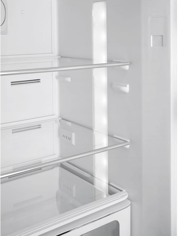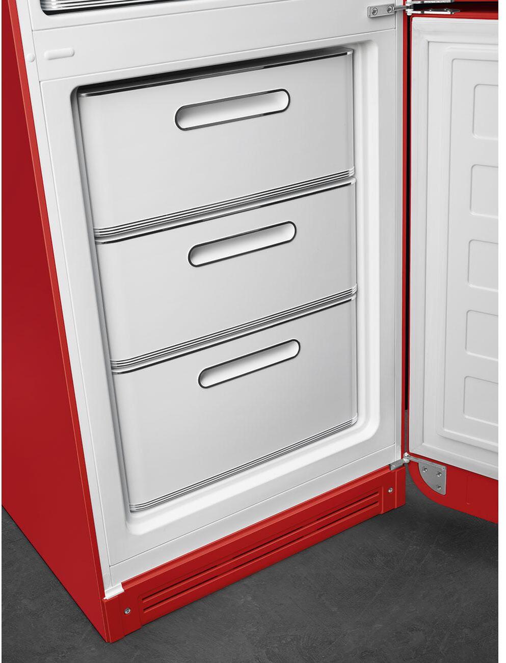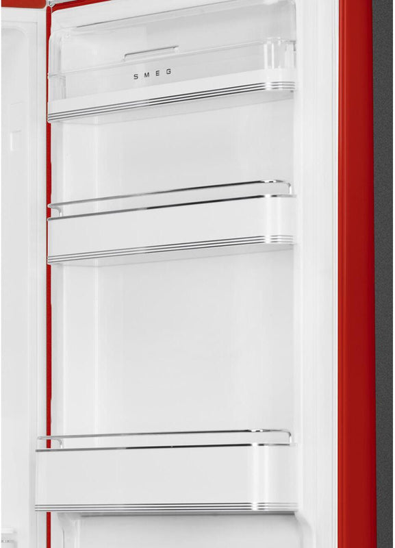 This red, right-hinged frost-free Smeg FAB32RRD5UK fridge freezer is part of the 1950s Retro Aesthetic range, combining vintage styling with the latest technology to achieve an excellent energy-efficiency rating. The 234 litre fridge contains three adjustable glass shelves, a fruit and vegetable crisper and a 0°C Life Plus drawer, which preserves perishable food for longer. The 97 litre three-drawer freezer has No Frost technology, so it’ll never require defrosting, and it includes a fast freezing drawer.