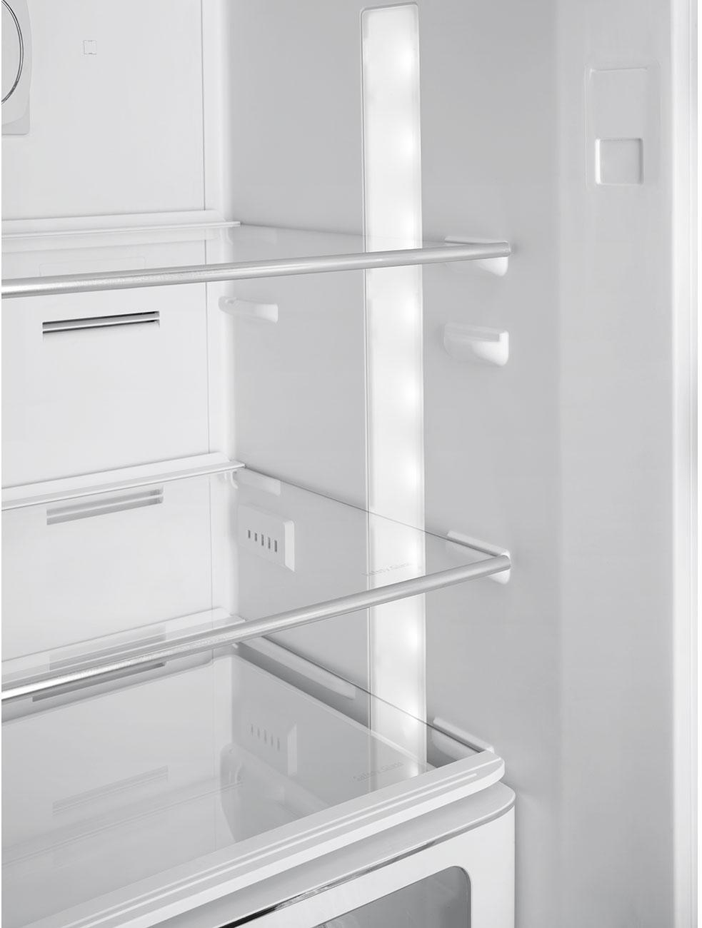 This white, right-hinged frost-free Smeg FAB32RWH5UK fridge freezer is part of the 1950s Retro Aesthetic range, combining vintage styling with the latest technology to achieve an excellent energy-efficiency rating. The 234 litre fridge contains three adjustable glass shelves, a fruit and vegetable crisper and a 0°C Life Plus drawer, which preserves perishable food for longer. The 97 litre three-drawer freezer has No Frost technology, so it’ll never require defrosting, and it includes a fast freezing drawer.
