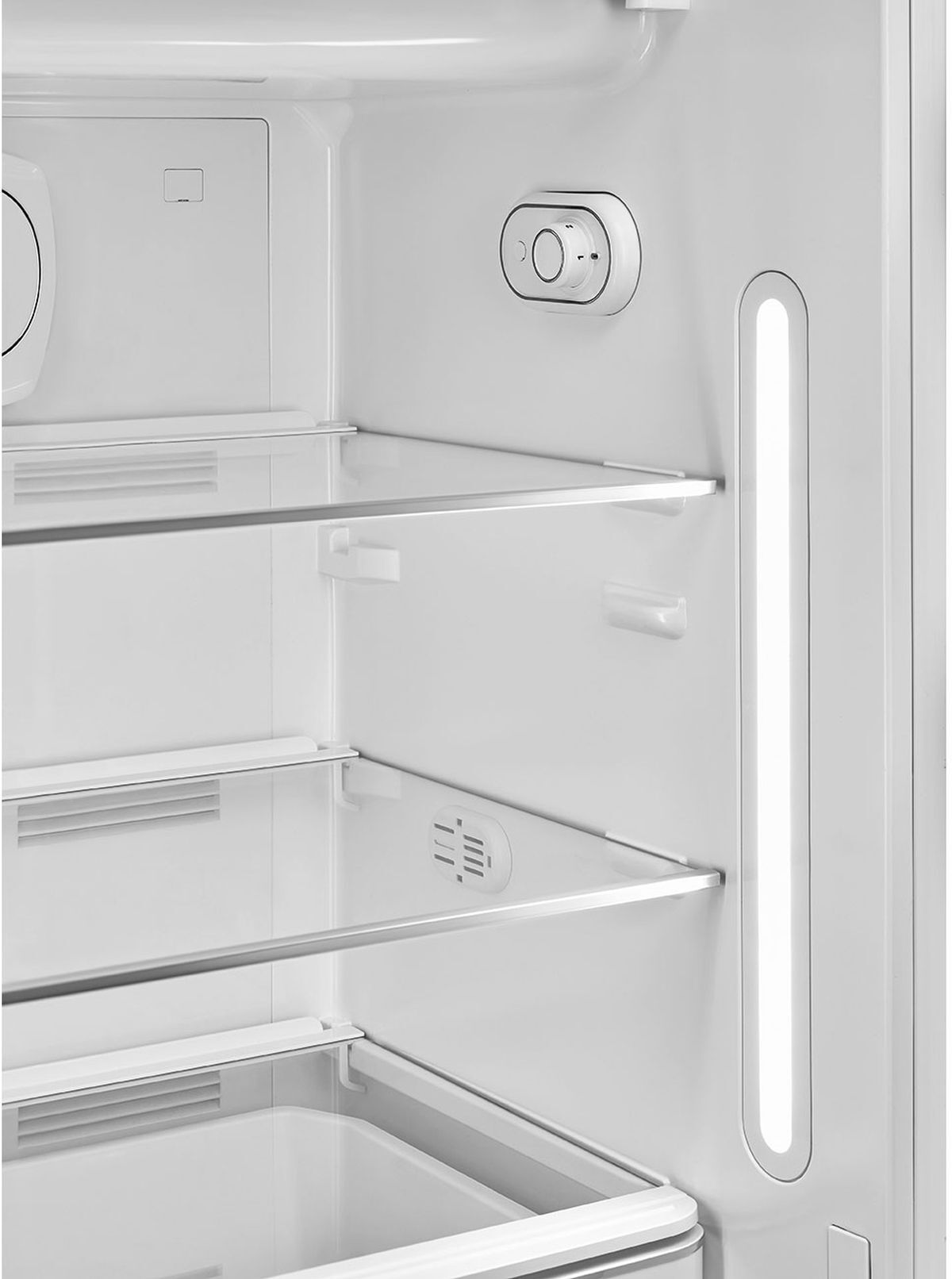 Performance-wise, the FAB28RYW5UK is equipped with fan-assisted cooling and Smeg’s Multiflow Cooling System, which ensures consistent airflow and even temperature distribution throughout the fridge, reducing hotspots and keeping food at ideal conditions. The fridge also features a rapid cooling function, perfect for quickly chilling groceries after shopping. The variable speed compressor adapts cooling power to maintain optimal temperatures, which, combined with the eco-friendly coolant, helps keep energy usage low and eco-conscious.