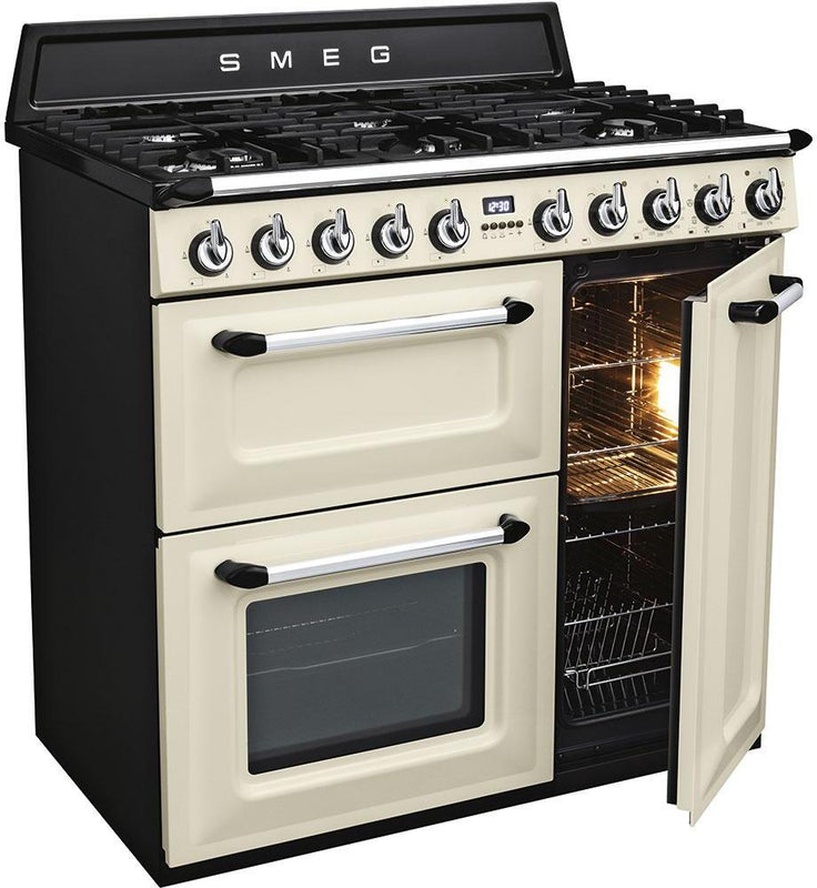 Smeg 90cm "Victoria" Traditional Dual Fuel 3 Cavity Cooker With Gas Hob, Cream Enamel Finish
