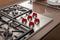 Wolf professional gas cooktops feature our signature red knobs - black or brushed stainless knobs are also available- set against a stainless steel control panel with laser-etched graphics and LED indicator lights.