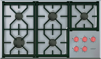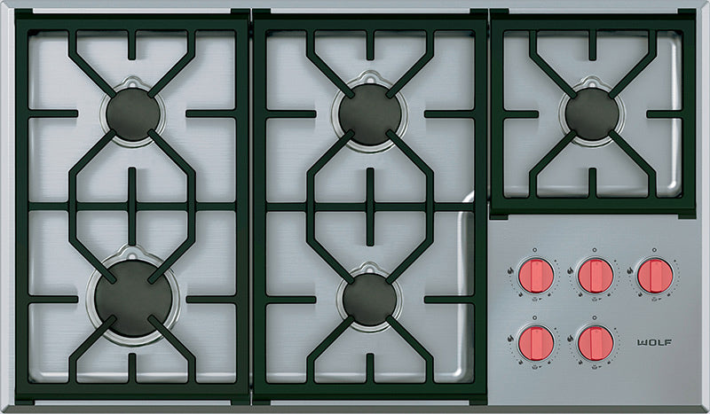 Our new line of professional gas cooktops is highlighted by signature design elements and performance features that have made Wolf a hallmark of chef-style kitchens. The 914mm professional gas cooktop offers five dual-stacked, sealed burners with a patented two-tiered design that gives cooks greater control over a wide range of heat output, from 5.3kW for restaurant-quality sears and fast boil times to a mere breath of flame for gentle simmering of sauces, soups and other delicate foods.
