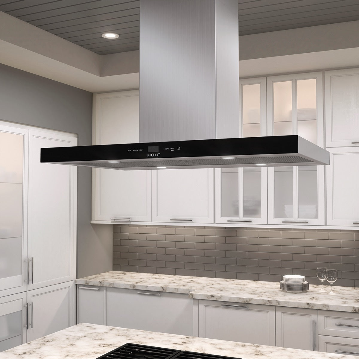 Wolf’s 1067mm Black Cooktop Island Hood is made up of stainless steel and black glass, making a design statement in any kitchen. The high styling of this cooktop wall hood complements the high performance of this unit, which features front mounted controls, brilliant LED lighting, and multiple speeds for the powerful blower. Filters are dishwasher-safe. The Wolf ICBVI42B is ideal for Wolf cooktops and integrated modules as part of an island application.